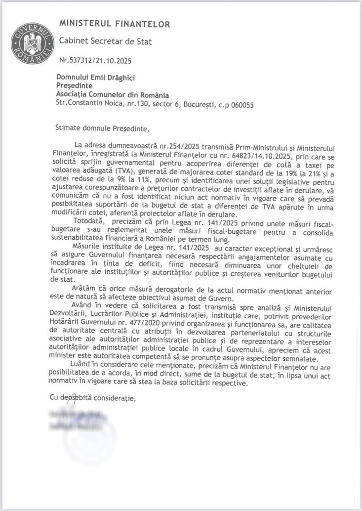Potrivit documentului oficial (Nr. 537312/21.10.2025), înregistrat la Ministerul Finanțelor, instituția confirmă că nu există în prezent niciun act normativ care să prevadă posibilitatea suportării din bugetul de stat a diferențelor de TVA generate de majorarea cotei standard de la 19% la 21% și de reducerea cotei reduse de la 9% la 11% pentru contractele de investiții aflate în derulare.