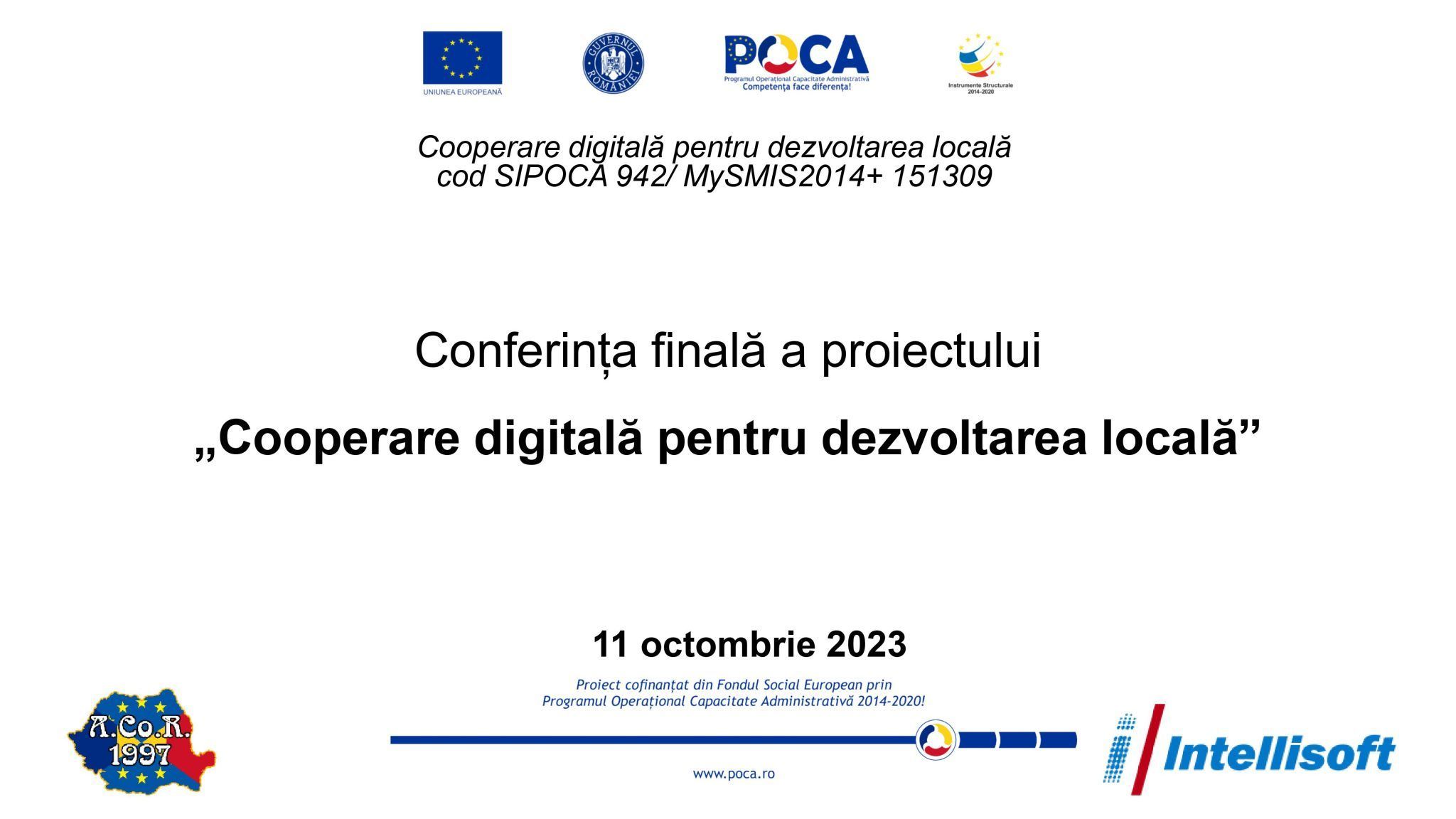 „Cooperare digitală pentru dezvoltarea locală” Conferința finală a proiectului „Cooperare digitală pentru dezvoltarea locală” În perioada 26 august 2022 – 26 octombrie 2023, Asociația Comunelor din România (ACoR) implementează, în parteneriat cu Asociația Intellisoft, proiectul „Cooperare digitală pentru dezvoltarea locală”, cod SIPOCA 942/ cod MySMIS 151309, finanțat prin Fondul Social European, în cadrul Programului Operațional[citește mai mult]