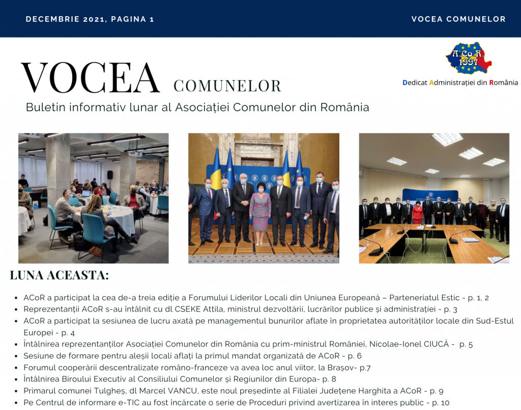 V-am pregătit Buletinul informativ al Asociației Comunelor din România – Vocea Comunelor, care prezintă succint o parte din activitatea ACoR din luna ianuarie și informații utile pentru autoritățile publice locale. LUNA ACEASTA ÎN VOCEA COMUNELOR: Reprezentanții ACoR s-au întâlnit cu dl Barna TÁNCZOS, ministrul mediului, apelor și pădurilor – p. 1, 2  Președintele Filialei Județene Buzău a[citește mai mult]
