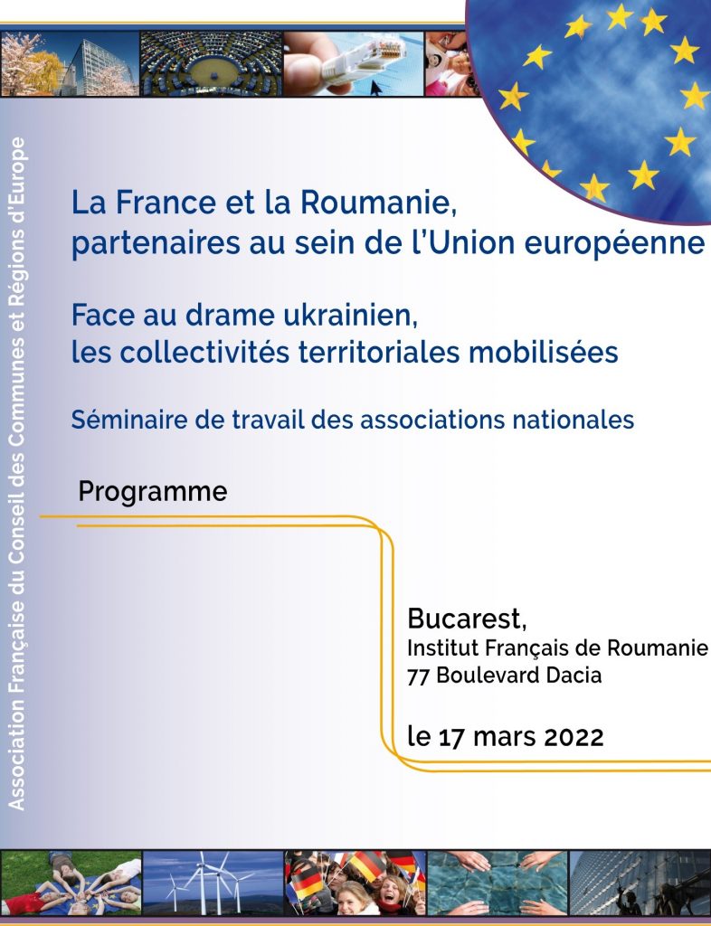 În data de 17 martie 2022, a avut loc seminarul de lucru „Colectivitățile teritoriale mobilizate, în fața dramei ucrainene”, desfăşurată în Sala Elvire Popesco a Institutului Francez din București, cu participarea reprezentanţilor Ministerului Dezvoltării, Lucrărilor Publice şi Administraţiei. Întâlnirea s-a desfăşurat sub egida Asociaţiei Comunelor din România, Uniunii Naţionale a Consiliilor Judeţene din România, Asociaţiei[citește mai mult]