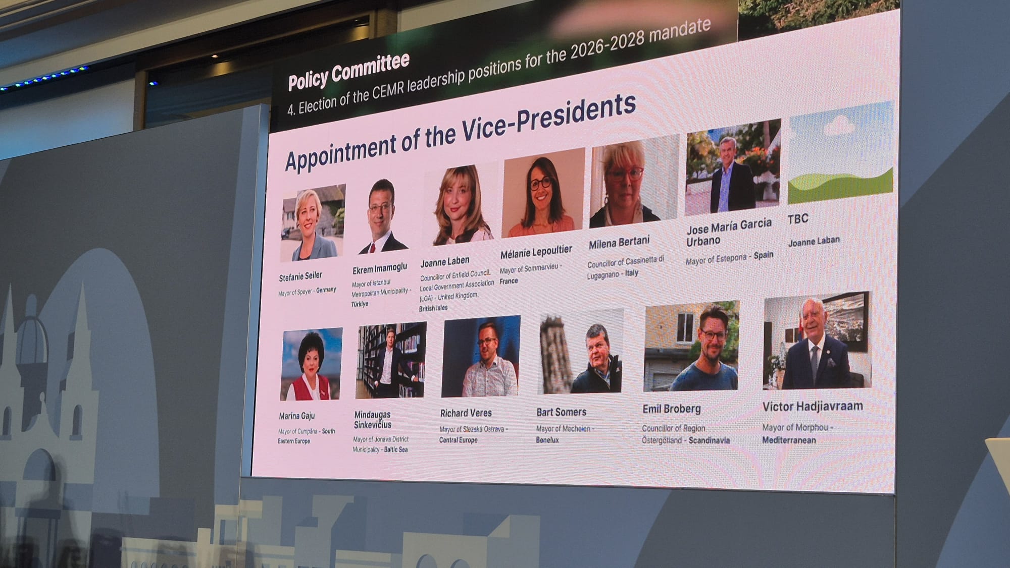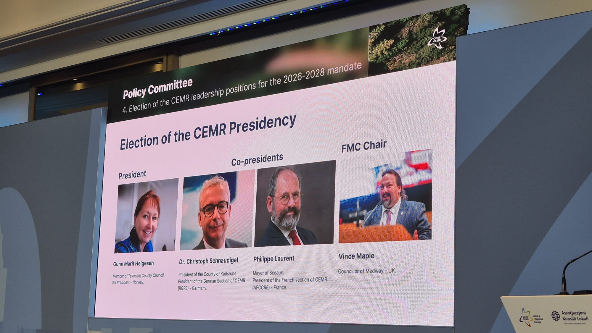 În cadrul evenimentului, având ca temă „Construirea Europei de la zero – Voci locale și regionale într-o lume în schimbare”, a fost aleasă întreaga structură de conducere a CEMR, pentru mandatul 2025-2028. Astfel, Gunn Marit HELGESEN, membră a Consiliului Județean Telemark și președinte al Asociației Autorităților Locale și Regionale din Norvegia (KS) (Norvegia) a fost aleasă președinte al CEMR, domnul Philippe LAURENT, primarul orașului Sceaux și președintele Asociației Franceze a Consiliului Comunelor și Regiunilor din Europa (AFCCRE) și Dr. Christoph SCHNAUDIGEL, președintele consiliului județean Karlsruhe și președintele Secției Germane a CEMR (RGRE) au fost aleși co-președinți ai CEMR, iar președinte al Comitetului de Management Financiar a fost ales domnul Vince MAPLE, consilier local din Medway, Asociația Autorităților Locale din Regatul Unit al Marii Britanii. Pe lângă doamna Mariana GÂJU, vicepreședinte CEMR pentru Europa de Sud-Est, reprezentând Albania, Bosnia-Hertegovina, Bulgaria, Croația, Muntenegru, Macedonia de Nord, România, Serbia și Slovenia, au fost aleși ca vicepreședinți și Stefanie SEILER, primarul orașului Speyer, Secția Germană a CEMR, Ekrem IMAMOGLU, primarul orașului Istanbul, Uniunea Municipiilor din Tucia (UMT), Joanne LABEN, consilier local orașul Enfield, Asociația Autorităților Locale din Regatul Unit al Marii Britanii, Melanie LEPOULTIER, primarul orașului Sommervieu și vicepreședinte al Consiliului Departamental Calvados, Asociația Franceză a Consiliului Municipiilor și Regiunilor Europene (AFCCRE), Milena BERTANI, consilier al orașului Cassinetta di Lugagnano, Secția Italiană CEMR (AICCRE), Jose María Garcia URBANO, primarul orașului Estepona, Federația Spaniolă a Municipiilor și Provinciilor (FEMP), reprezentând Spania și Portugalia, Mindaugas SINKEVICIUS, primarul municipiului Jonava, Asociația Autorităților Locale din Lituania (ALAL), reprezentând Estonia, Letonia, Lituania și Polonia, Richard VERES, primarul orașului Slezska Ostrava, Uniunea Orașelor și Municipiilor din Republica Cehă (SMOCR), reprezentând Austria, Cehia, Ungaria și Slovacia, Bart SOMERS, primarul orașului Mechelen, Asociația Orașelor și Municipiilor Flamande (VVSG), reprezentând Belgia, Luxembourg și Olanda, Emil BROBERG, consilier al regiunii Ostergotland, Asociația Suedeză a Autorităților Locale și Regiunilor (SALAR), reprezentând Danemarca, Finlanda, Islanda, Norvegia și Suedia și Victor HADJAVRAAM, primarul orașului Morphou, Uniunea Municipiilor din Cipru (UCM), reprezentând Cipru, Grecia, Israel și Malta.