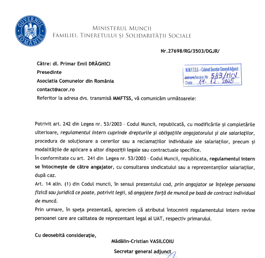 În răspunsul transmis Asociației Comunelor din România, Ministerul Muncii, Familiei, Tineretului și Solidarității Sociale precizează că, potrivit Codului muncii, regulamentul intern cuprinde drepturile și obligațiile angajatorului și ale salariaților, precum și procedurile aplicabile în cadrul raporturilor de muncă, fiind întocmit de angajator, cu consultarea sindicatului sau a reprezentanților salariaților, după caz.