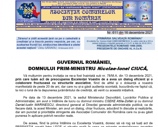 Vineri, 17 decembrie, reprezentanții Asociației Comunelor din România (ACoR) au participat, la Palatul Victoria, la[citește mai mult]